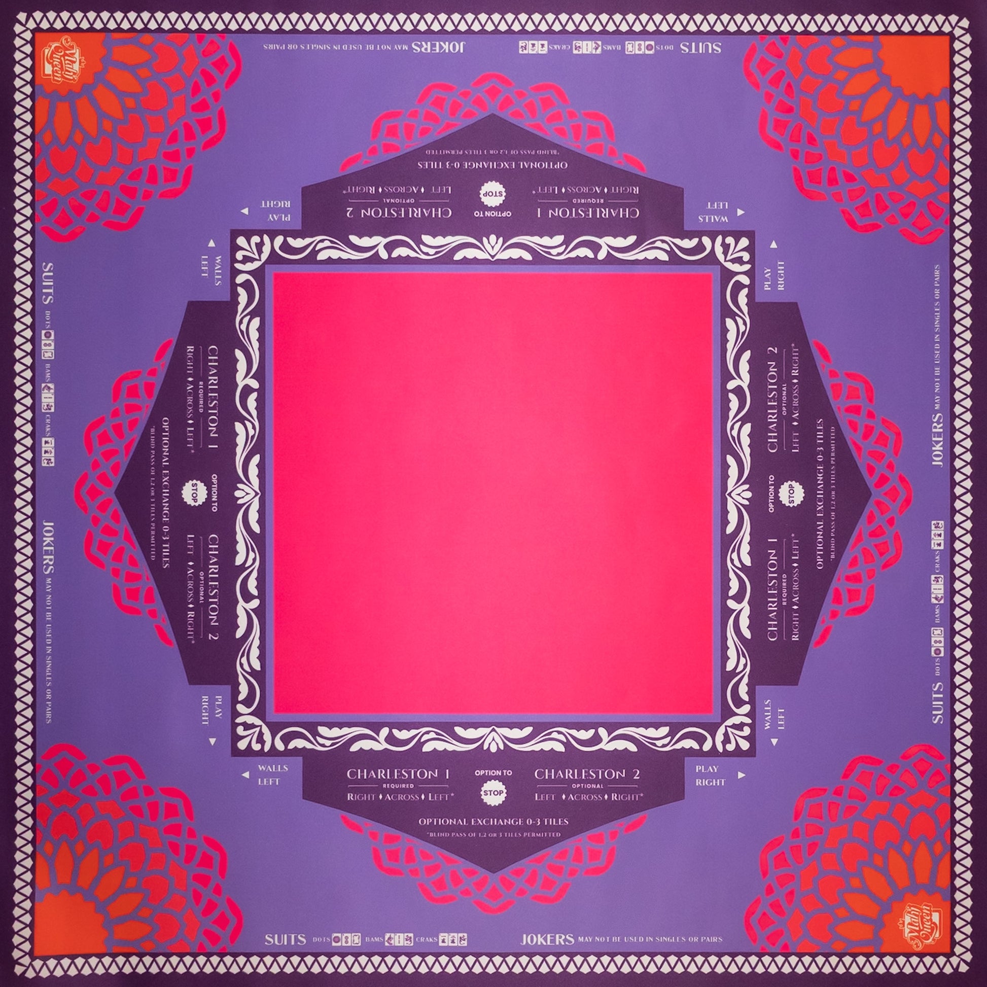 The Royal Crush Mahjong Mat from Mahj Queen™ brings serious heat to your game night with a vivid fusion of hot pink, amethyst, deep purple, and fiery orange. The bold geometric floral design makes this mat feel equal parts glamorous and powerful—fit for queens who play with passion.
